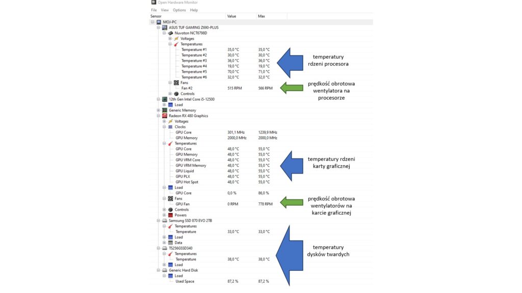 c. prędkość obrotową wentylatora procesora, wentylatorów na karcie graficznej i pozostałych wentylatorów w obudowie sprawdzisz również programem Open Hardware Monitor